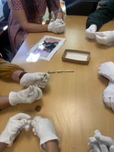 “Pernille havde særlige museumshandsker med til alle og efter, at eleverne havde set og vurderet de forskellige skraldeposer, fandt Pernille nogle ægte museumsfund frem. Dem måtte eleverne holde og nærstudere, når blot de havde handsker på. Der var genstande der var mellem 400 og 3500 år gamle. Der var en skinnebensknogle fra en ko der var cirka 800 år gammel, to flintøkser fra stenalderen, en vævevægt fra vikingetiden og en kridtpibe fra 1500-tallet,” fortæller hun.